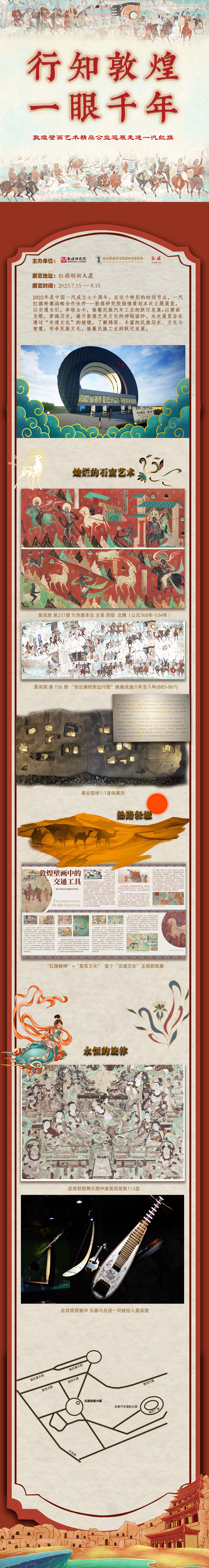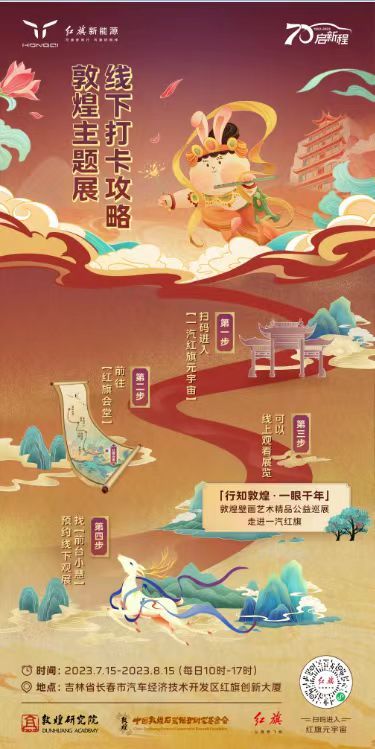 2023年是中国一汽成立七十周年。在这个特别的时间节点,一汽红旗特邀战略合作伙伴——敦煌研究院倾情策划本次主题展览。以交通为引,串联古今,致敬民族汽车工业的跃迁发展;以壁画为眼,穿越历史,揭开敦煌艺术文化的神秘面纱。本次展览旨在透过“交通文化”的棱镜,了解绵延、丰富的民族历史、文化与智慧,传承民族文化,致敬民族工业的跃迁发展。(徐畅)