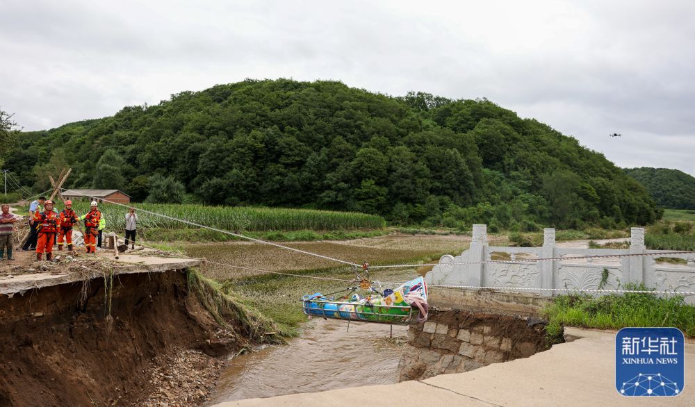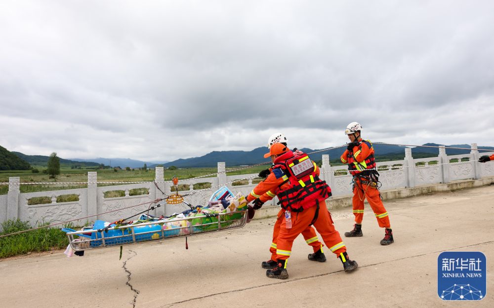 8月6日,吉林市消防救援支队队员利用绳桥解救受困村民。
