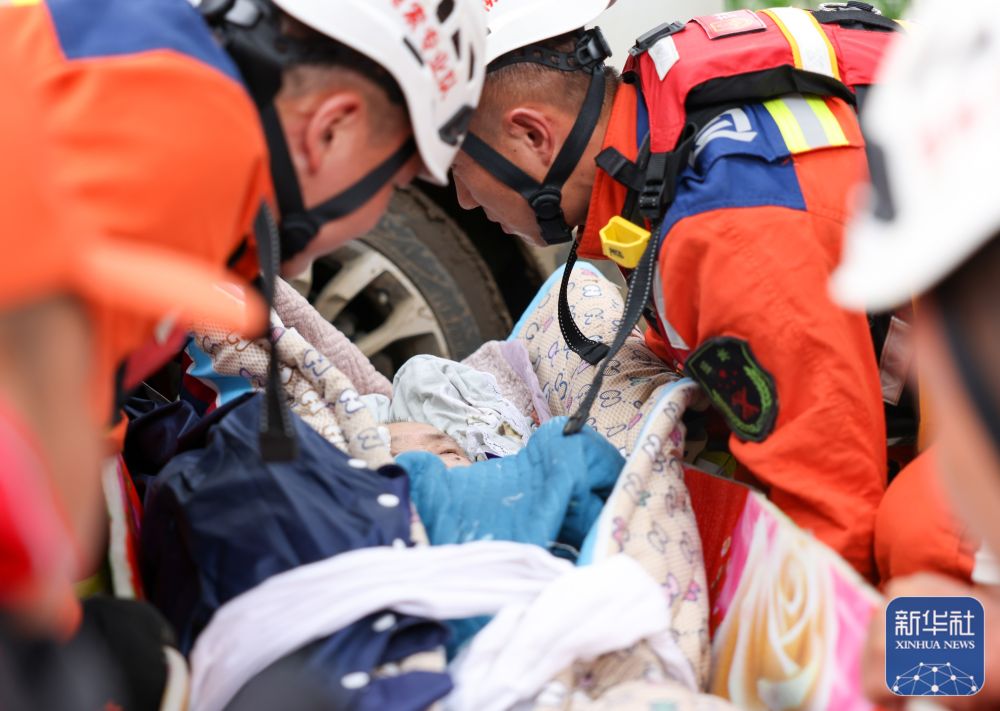 8月6日,吉林市消防救援支队队员用担架抬着曲凤霞通过损毁路面。