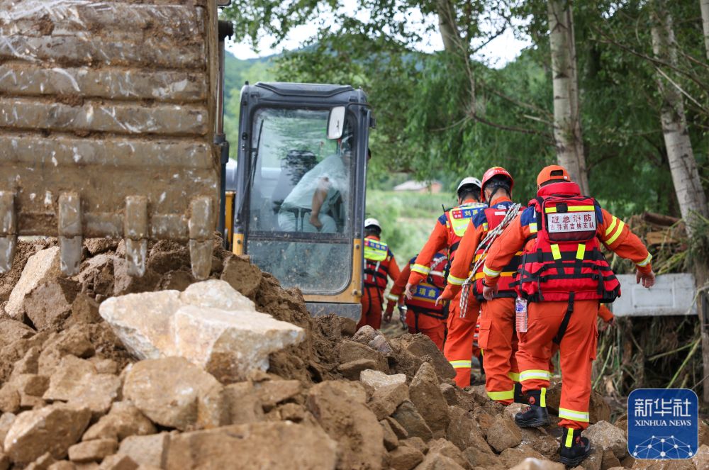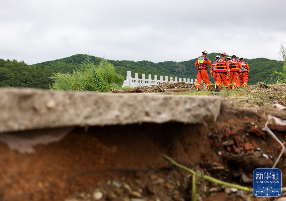 8月6日,吉林市消防救援支队队员徒步穿过坍塌的道路前往受困人员位置。