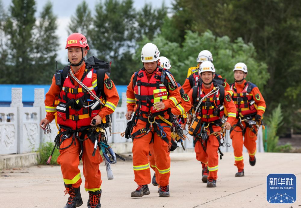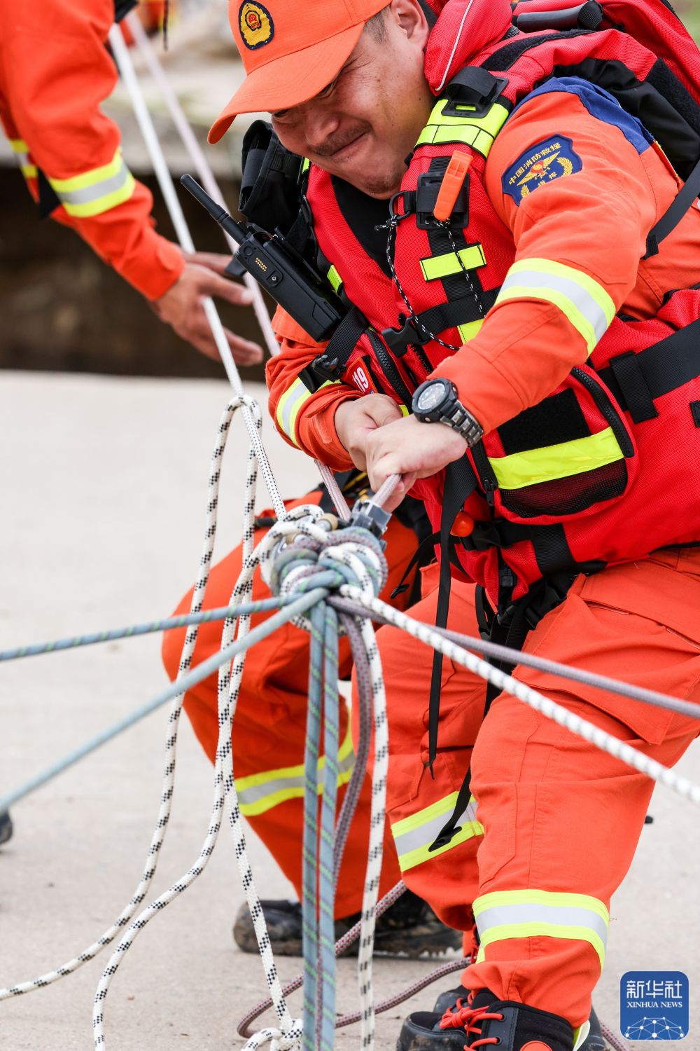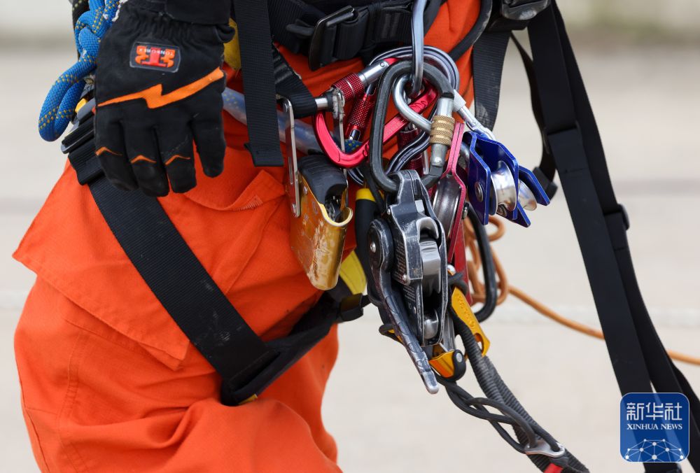 8月6日,吉林市消防救援支队队员整理身上的绳索工具。