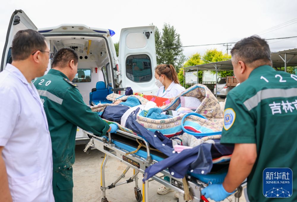 8月6日,吉林市消防救援支队队员将曲凤霞转运到安全地带。