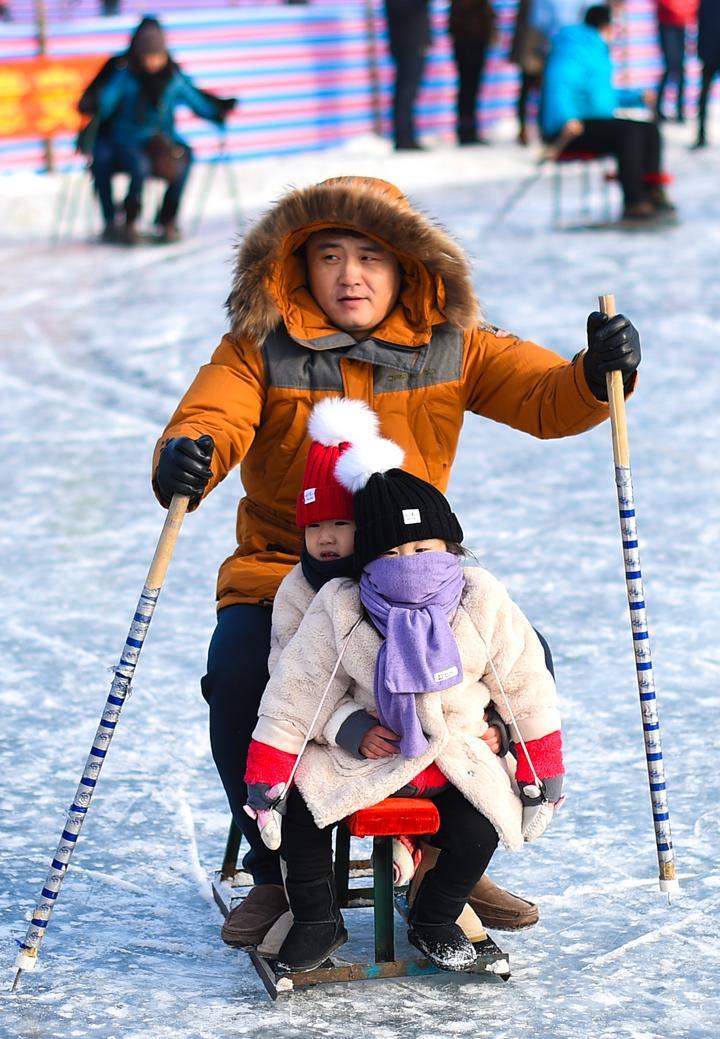 一位市民带着孩子在在长春市南湖公园体验冰爬犁。新华社记者 许畅 摄