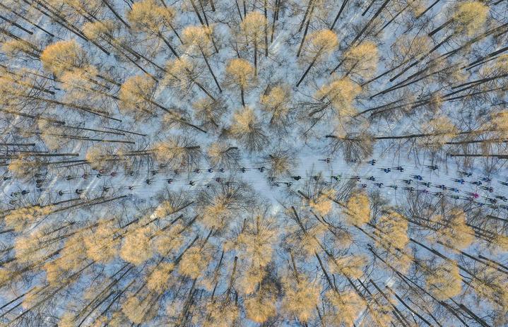 参赛选手在2020中国长春净月潭瓦萨国际滑雪节暨2020国际雪联越野滑雪中国巡回赛长春站比赛中(无人机照片)。新华社记者 许畅 摄