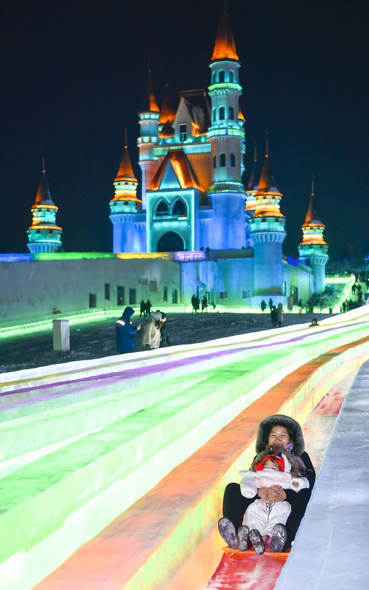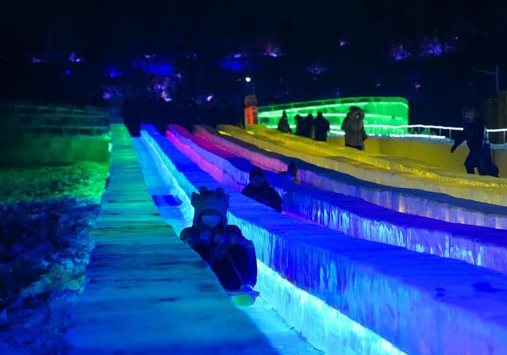 市民在长春冰雪新天地玩冰滑梯。新华社记者 王帆 摄