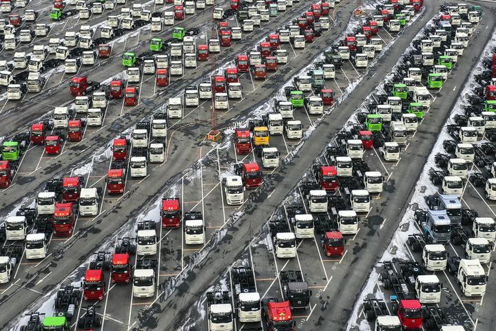 这是位于吉林长春的一汽解放智慧物流公司整车物流部停车场内即将转运交付的车辆。新华社记者 许畅 摄