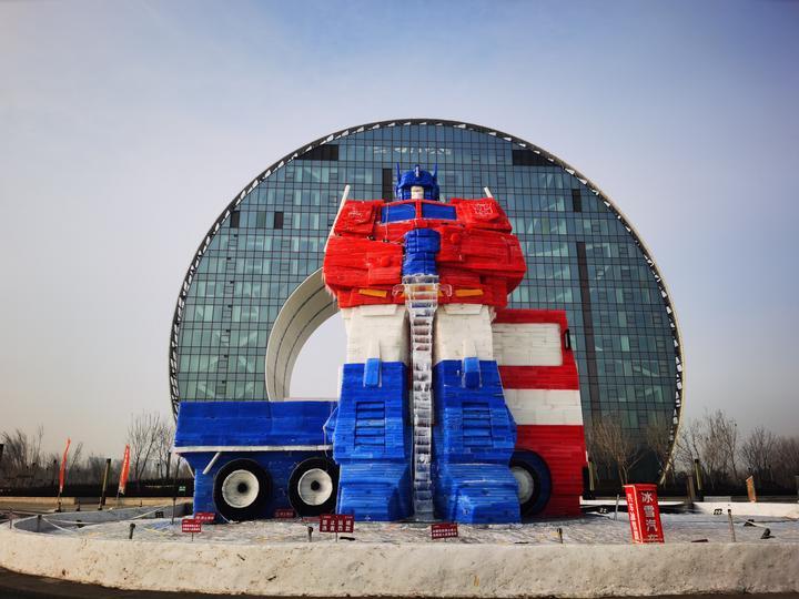 在长春国际汽车公园内拍摄的彩色冰雕“汽车人”擎天柱。新华社记者 张博宇 摄