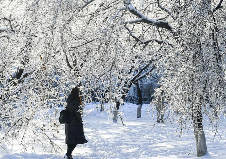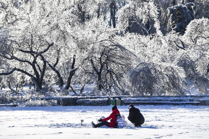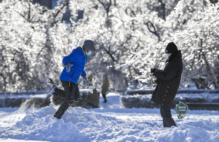 市民在长春市文化广场欣赏雪景。新华社记者 许畅 摄