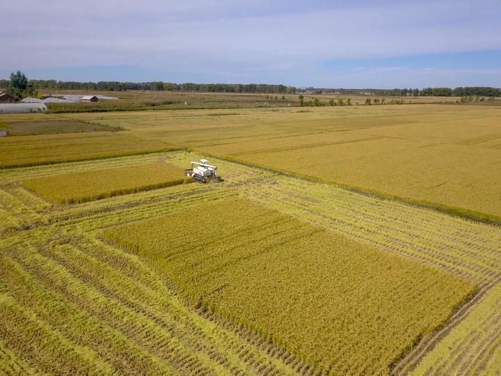 在吉林省长春市九台区龙嘉农乐种植家庭农场,农民驾驶农机收割水稻(无人机照片)。新华社记者 张楠 摄