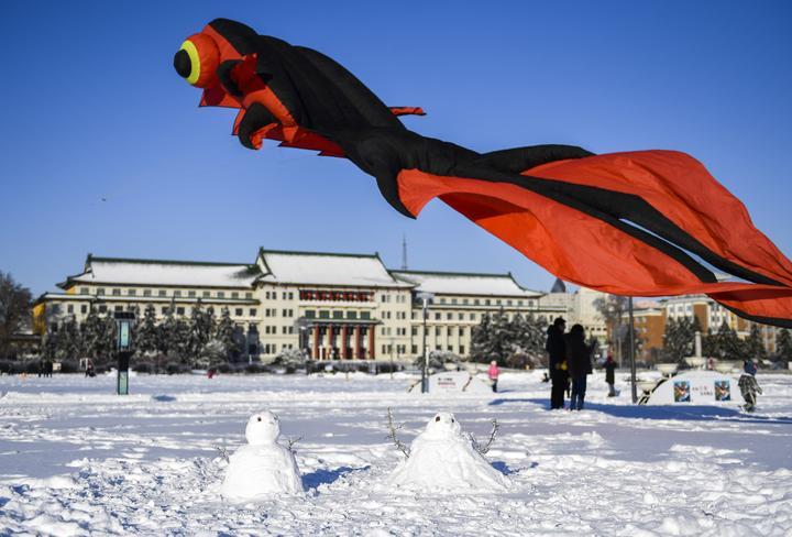 在长春市文化广场拍摄的雪地中的两个雪人。新华社记者 许畅 摄