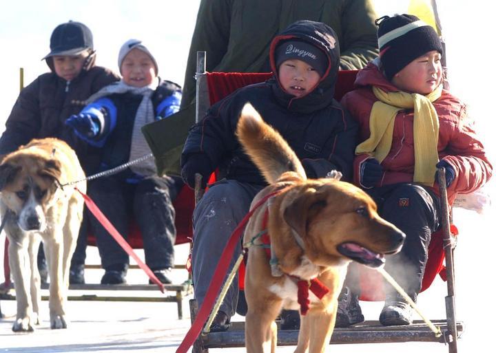 几位小朋友在长春净月潭国家森林公园内乘坐狗爬犁。新华社记者 徐家军 摄