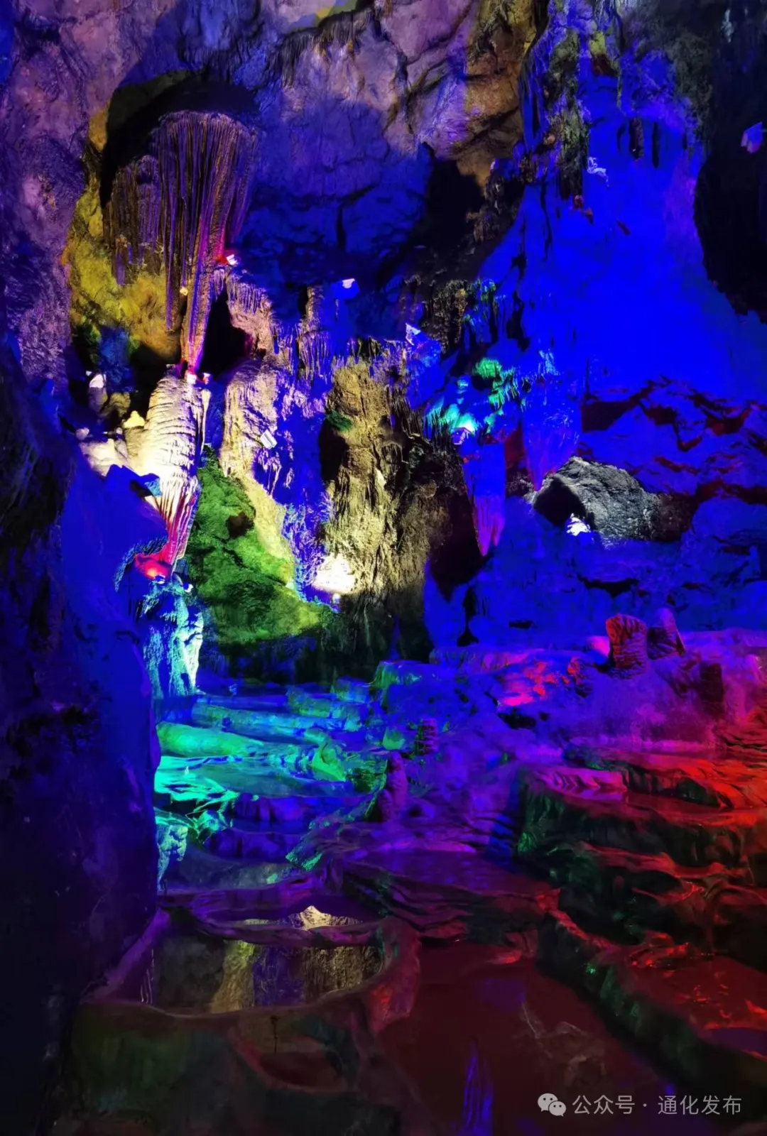金秋9月,走进通化溶洞景区,空气清新、心旷神怡,连绵起伏的青山和道路两旁姹紫嫣红的鲜花让人目不暇接。“太神奇了,特别是那些石幔、石笋,在霓虹灯下光怪陆离、蔚为壮观。”采风团被秘境曲折幽深的洞势地貌,瑰丽多姿的溶石景观所吸引,纷纷拿起手机、相机不停地拍摄。通化溶洞是第四纪火山活动所遗留下的一处天然洞穴,也是长白山西麓火山群中最为典型的一座,更是目前国内最大的火山溶洞,景区占地面积 80万平方米,洞道上下起伏、左右迂回,总长超过4000米,串联起十个各具特色的大型洞厅。景区现已成为集景色观赏、科学考察、体验探险和休闲度假为一体的旅游度假胜地。