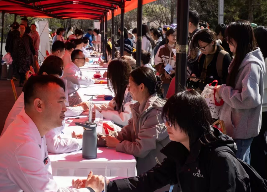 义诊咨询区,10名来自附属医院及附属第三临床医院的专家现场坐诊,为市民把脉、问诊、开方。附属第三临床医院内分泌代谢病与脾胃病科副主任医师温琦一上午接诊上百人,她表示义诊不仅是免费看病,更是传递人文关怀、推动健康公平的桥梁,希望能有更多机会参与此类活动。与此同时,针灸推拿学院师生及博硕医疗服务团志愿者宣传普及中医养生保健知识,让市民体验推拿、按摩等保健手法。