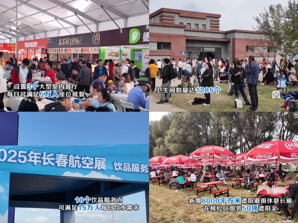 长春航空展期间,良好的游客就餐、饮水和休息条件,得到网友一致好评。(拼版图片)