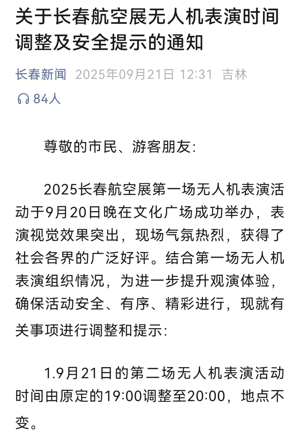 21日,一则长春航空展无人机表演时间调整的新闻,成为人们关注的焦点:从原定的19时调整至20时,即延后1小时。长春轨道交通集团也发布通知:为缓解活动前文化广场站出站大客流,高效疏散返程乘客,当日的地铁1、2号线行车、进出站也进行调整。