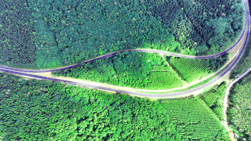 从高空俯瞰,G331项目环长白山段一级公路分离式路基被茂密森林环绕
