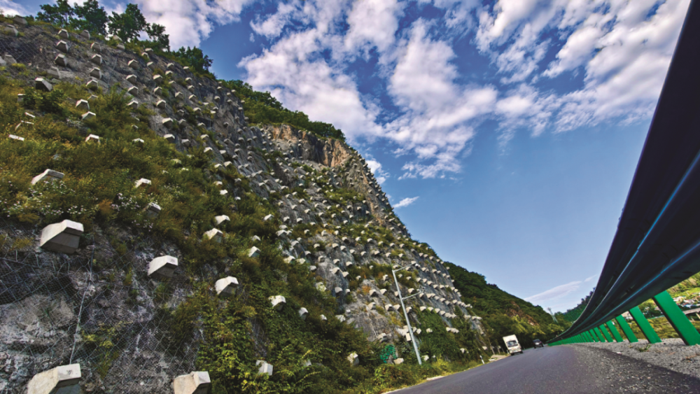 在G331项目吉林段224公里+750米处,锚索深入山体,防护网紧贴突出山岩,保障道路通行安全