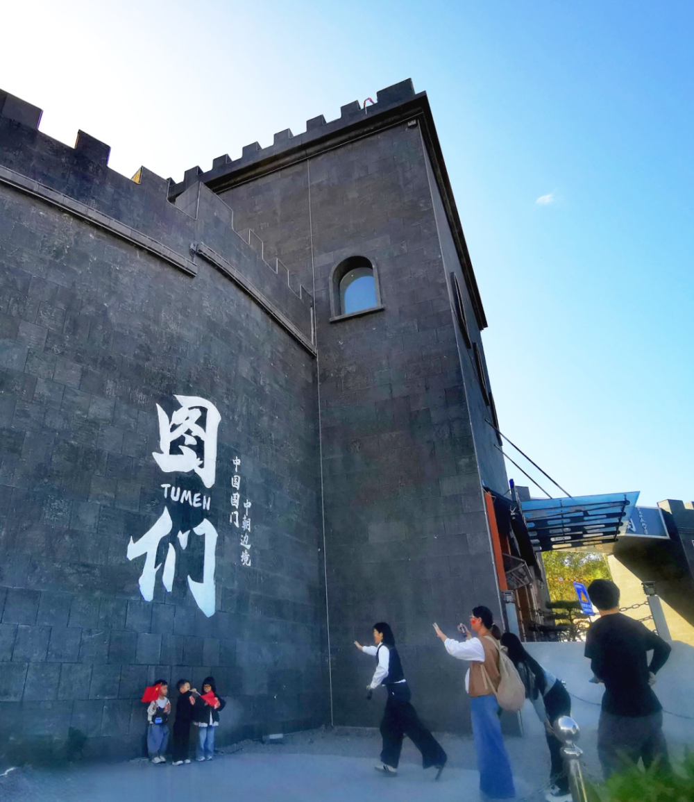 游客在G331项目旁边的图们市日光山景区山门处拍照