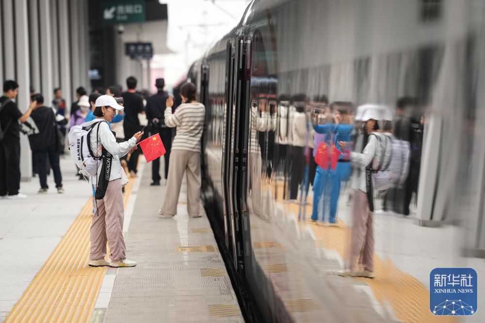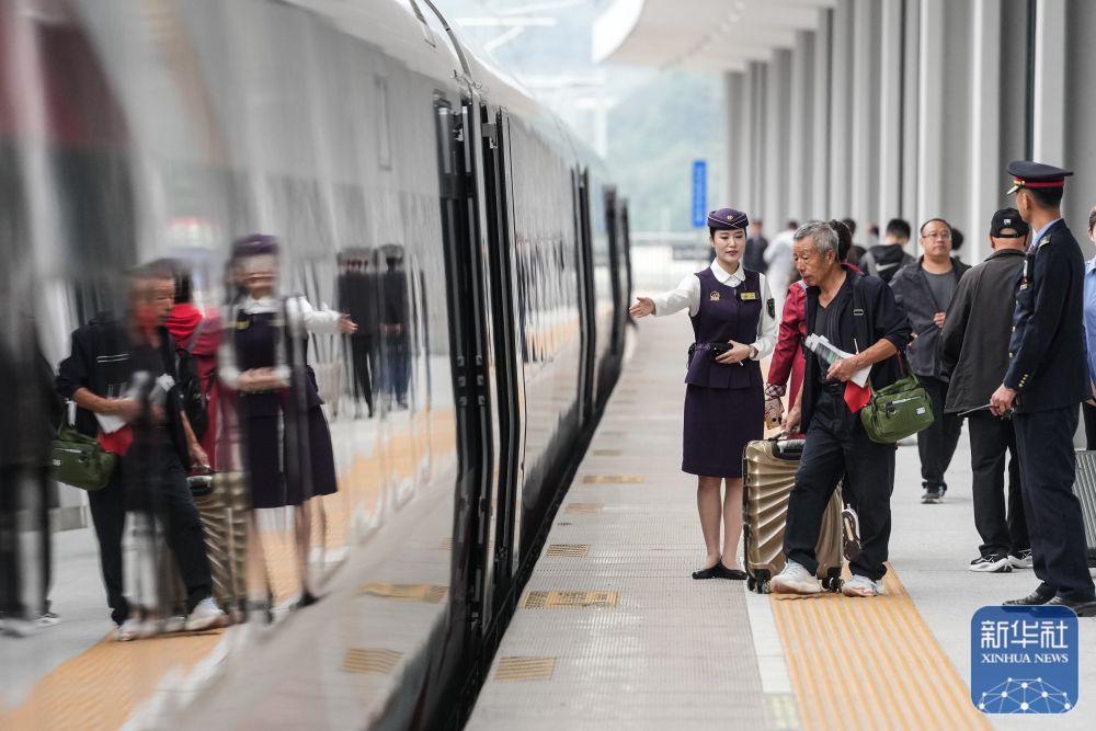 ↑ 9月28日,旅客在长白山站陆续登上G8166次列车。新华社记者 张楠 摄