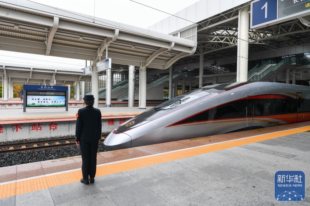 ↑ 9月28日,从长白山站开往沈阳北站的G8166次列车驶入长白山站。新华社记者 张楠 摄