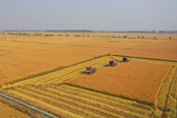 10月14日,在吉林省公主岭市,农民驾驶农机收割水稻(无人机照片)。