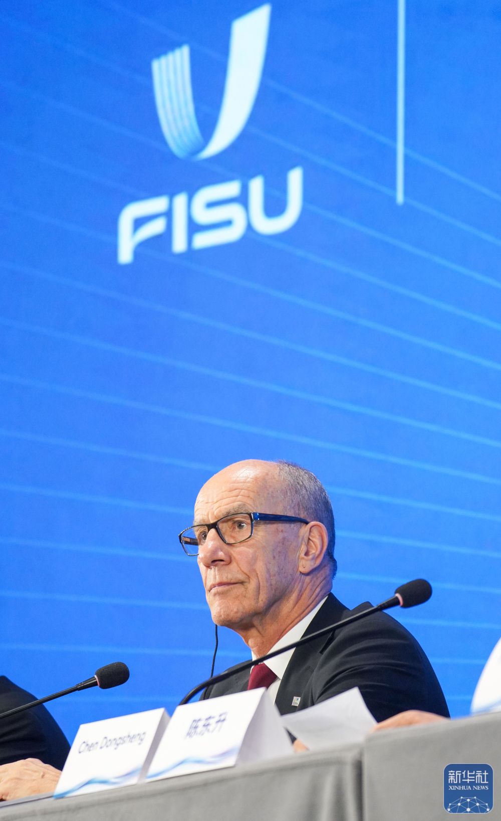 ↑ 国际大学生体育联合会主席雷诺·艾德在新闻发布会上。