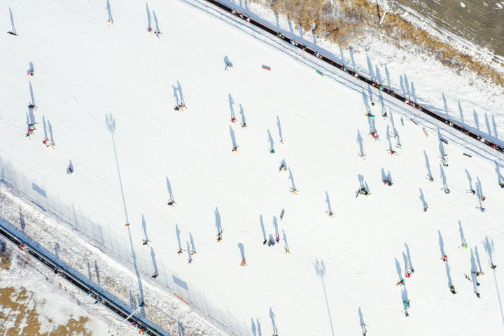 12月3日,众多学生、家长和滑雪爱好者在长春市天定山滑雪场滑雪(无人机照片)。
