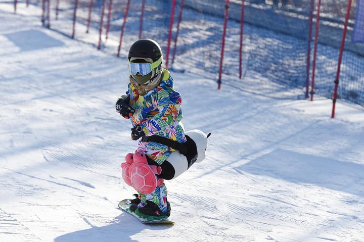 12月3日,吉林市一小学生在吉林市纳美山谷度假区学习单板滑雪。