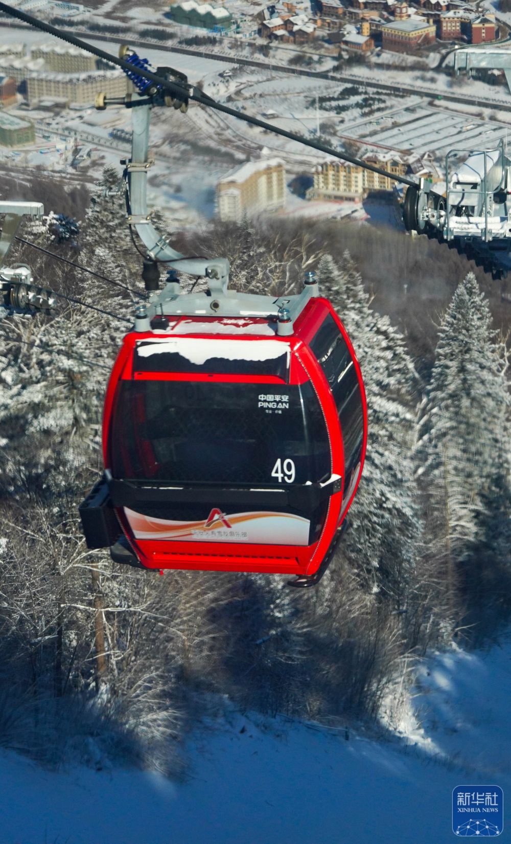 ↑ 在吉林市北大湖滑雪度假区,滑雪爱好者乘坐国产缆车达到山顶(无人机照片)。