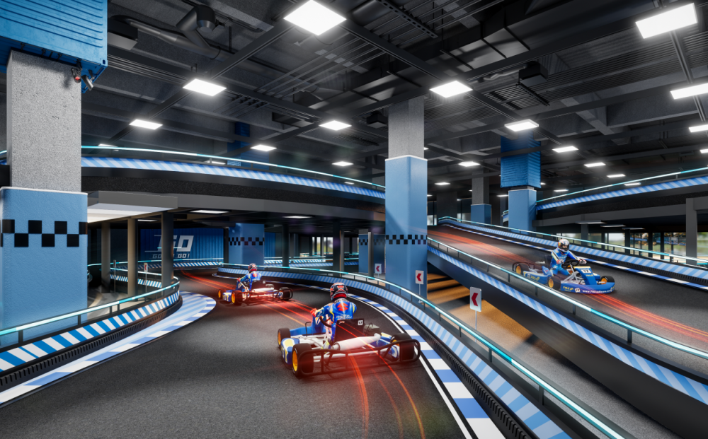 快乐地潮玩中心位于生态大街与天泽大路交会处的东部车城2号楼,面积为3.2万平方米。其中,6000平方米的赛文卡丁车引进了40台德国卡丁车,打造600米双层立体赛道,搭配10余个专业立体弯道。