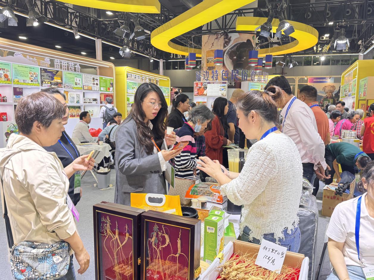 “我们的长白山人参是国家地理标志产品,这次还带来了野山参、红参、人参口服液等系列产品,深受欢迎。”吉林省雪参山参茸有限公司经理田洪超说。