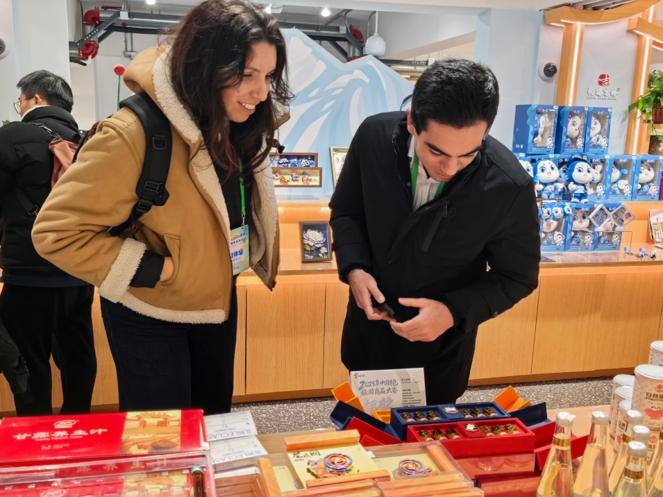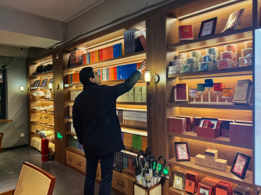 采风团走进春京西历史文化街区,作为长春市首个建成并投入使用的历史文化街区项目,其历史可追溯至二十世纪初。在“礼遇吉林店”,采风团成员的赞叹声和相机、手机的快门声频频响起,琳琅满目的吉林特产吸引了众人的目光。“It's so cute.”美国自媒体博主于中美一边拿着查干湖的文创产品“查小鱼”玩偶,一边感叹道。