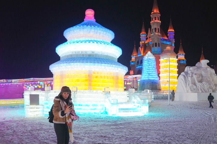 12月18日,外国媒体记者在长春市冰雪新天地景区录制出镜视频。