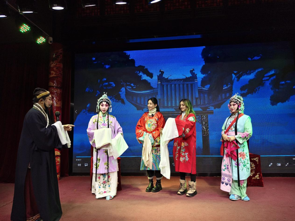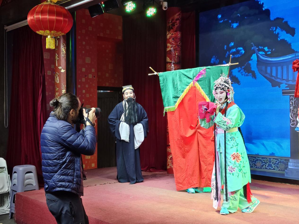 餐厅前部就是一方戏台,台上响起皮黄之声。两位京剧演员踏着台步登场,专业的京剧腔引得全场注目、拍手称好。水袖翻飞间,来自美联社的Dan Sandoval放下了筷子,专注地用相机拍摄这一中国传统艺术。美国自媒体博主于中美被邀请上台互动,在现场老师的指导下穿上戏服,甩袖踱步,引得台下连连鼓掌。“美食与艺术的结合,让文化变得更容易感受。”一位外国媒体记者说。