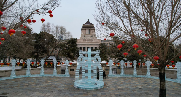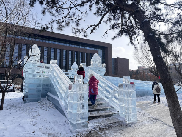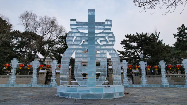 冰雕位于吉林大学基础医学院门前,核心景观为立体“春”字雕塑,采用传统砖雕风格的立体构造,造型富有艺术感。