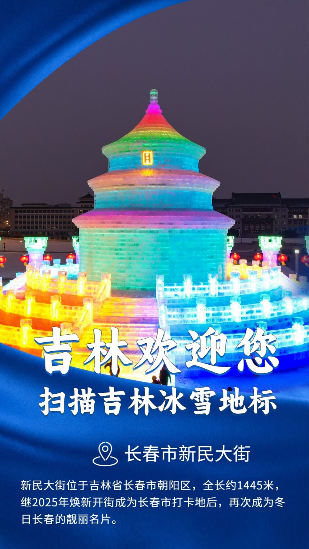 傍晚,走进长春市新民大街,一组组光彩夺目、绚丽缤纷的大型冰雕雪塑亮相街头,吸引众多市民游客拍照打卡,继2025年,焕新开街成为长春市热门打卡地后,新民大街再次成为冬日长春的靓丽名片。