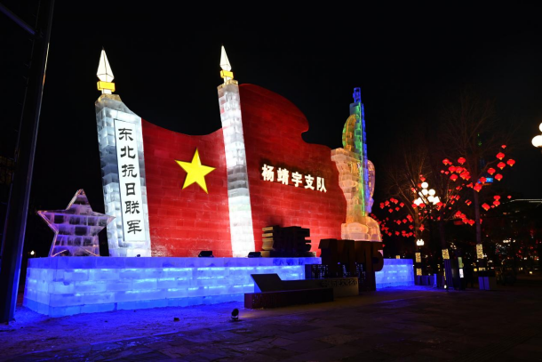 该冰雕位于新民大街与解放大路交汇,通过分层搭建与动态灯光技术,融合东北抗日联军旗帜、杨靖宇支队标识、步枪造型及“新民1445”字样等元素,形成立体且富有张力的艺术形态,打造长春“传承红色基因、展现城市底蕴”的生动名片,助力“冰雪文化+红色文旅”的品牌融合发展。