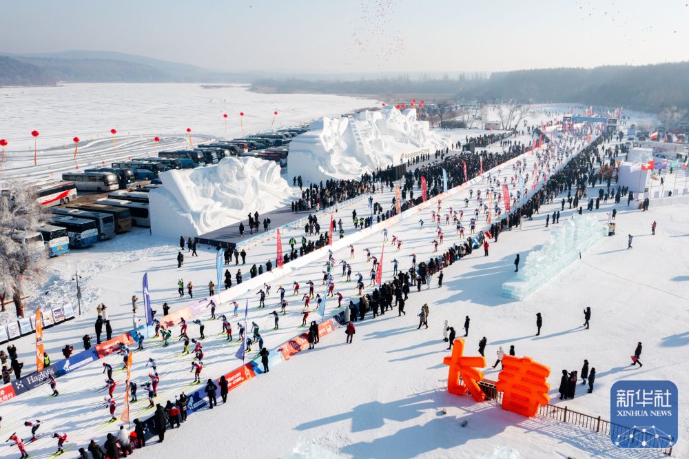 1月4日,第24届中国长春净月潭瓦萨国际滑雪节在长春市净月潭国家森林公园启幕,参赛选手在比赛中(无人机照片)。新华社记者 许畅 摄