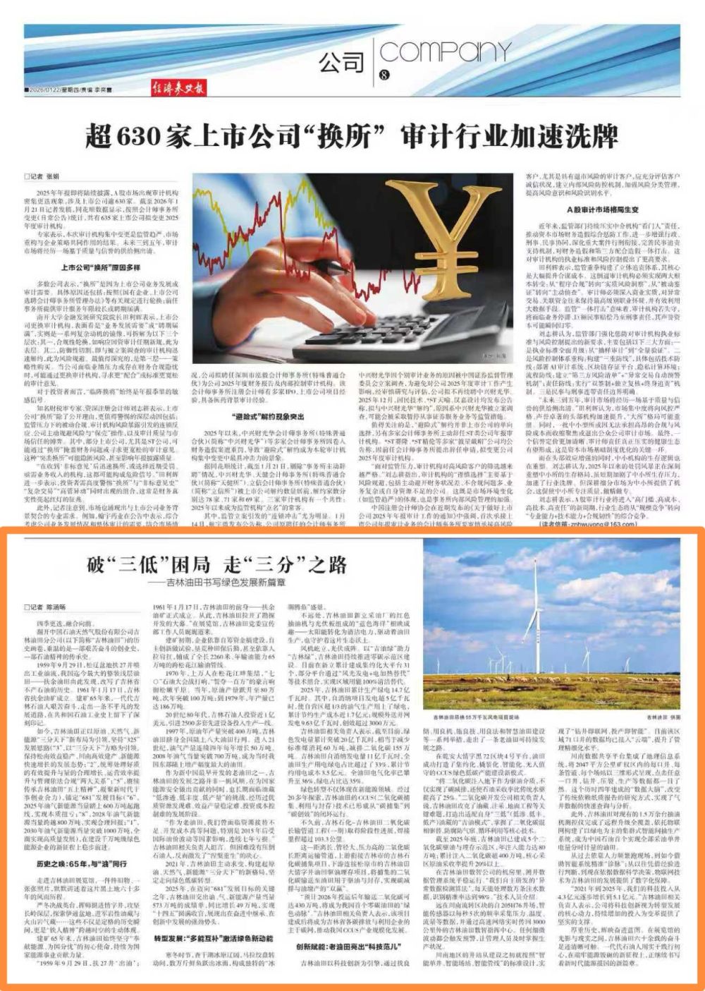 如今,吉林油田正以原油、天然气、新能源“三分天下”新布局为引领,坚持“325”发展思路(“3”,以“三分天下”方略为引领,保持松南效益稳产、川南高效建产、新能源快速增长的发展态势;“2”,统筹处理好质的有效提升与量的合理增长、运营效率提升与管理依法合规“两大关系”;“5”,赓续传承吉林油田“五上精神”,凝聚新时代干事创业合力),锚定“681”发展目标(“6”,2025年油气新能源当量踏上600万吨起跑线,实现本质扭亏;“8”,2028年油气新能源当量跨越800万吨,实现合理回报;“1”,2030年油气新能源当量突破1000万吨,全面实现高质量发展),在建设千万吨级绿色能源企业的新征程上稳步前进。