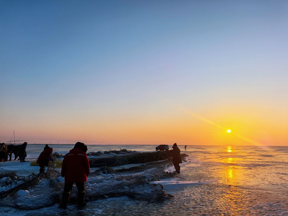 湖面上,零下二十几摄氏度的气温,叠加卷着冰碴呼啸而来的寒风,不一会儿就把人的脸吹得生疼,让人手脚活动困难。这样的严寒,对于渔把头和渔民们来说已是家常便饭。