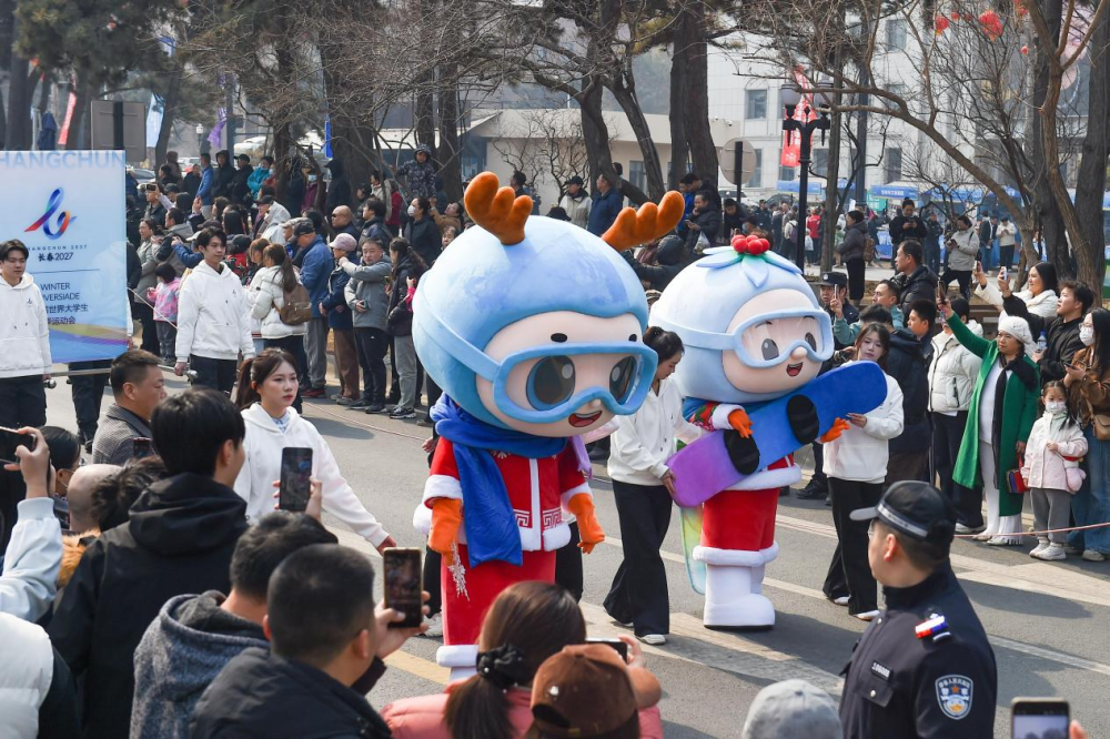 在倒计时活动现场,还开展了丰富多彩的非遗展演、高校快闪、群众体育等百余场活动,上万名市民走上长春新民大街,与“吉冰”“吉雪”合影互动,共同期盼大冬会的到来。