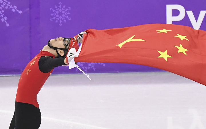 2018年2月22日,武大靖在平昌冬奥会短道速滑男子500米决赛夺冠后手持国旗庆祝。新华社记者 王昊飞 摄