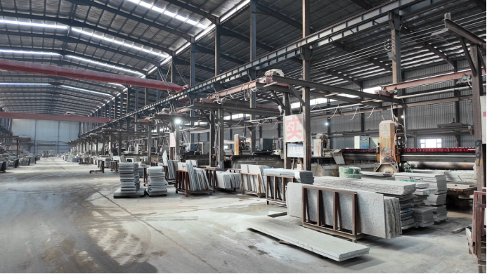 在吉林省建江石业工艺有限公司的车间内,机器轰鸣,自动化石材加工生产线高速运转。切割、打磨、抛光等工序有条不紊,一块块优质石板材有序下线,现场一派热火朝天的生产景象。
