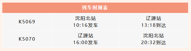 2026年“五一”假期将至,探亲出游、短途出行客流大幅增长。为保障旅客顺畅出行,铁路部门计划于5月1日、2日、3日、5日,加开沈阳北至辽源K5069次、辽源至沈阳北K5070次临时旅客列车,实行当日往返,有效扩充假期运输运力。