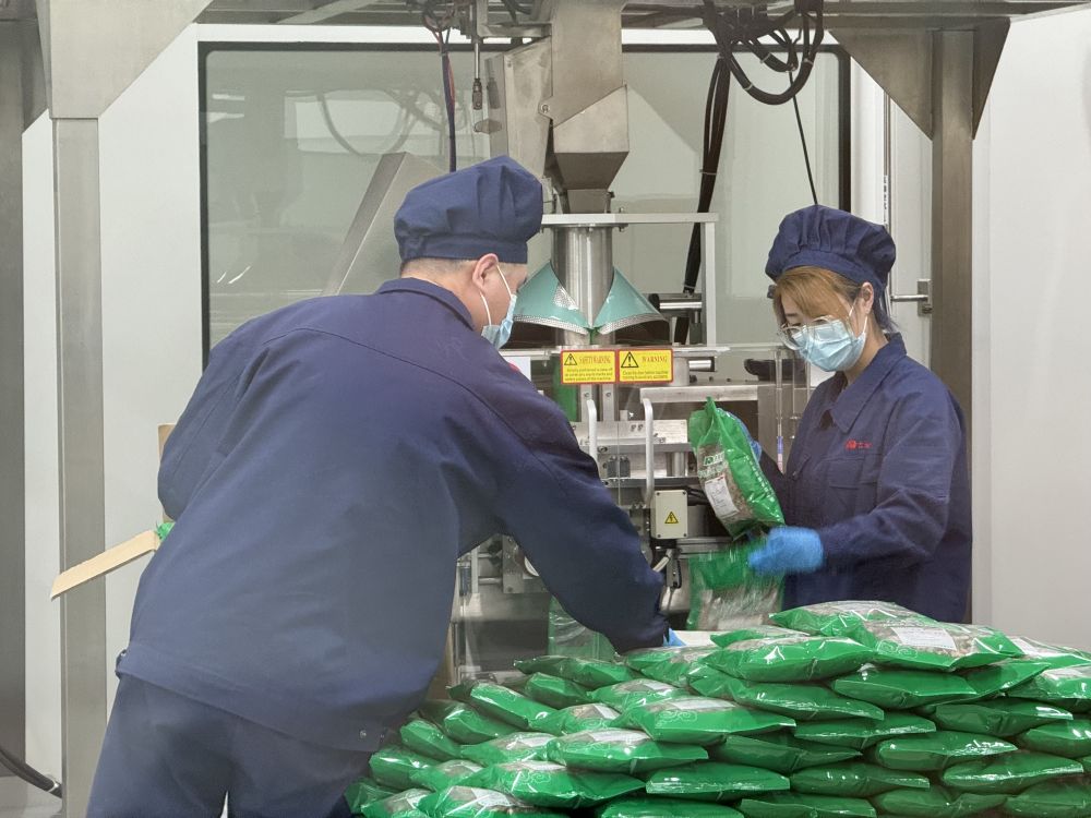 敖东世航药业的智能中药饮片生产车间内,工人在挑拣检查成品。