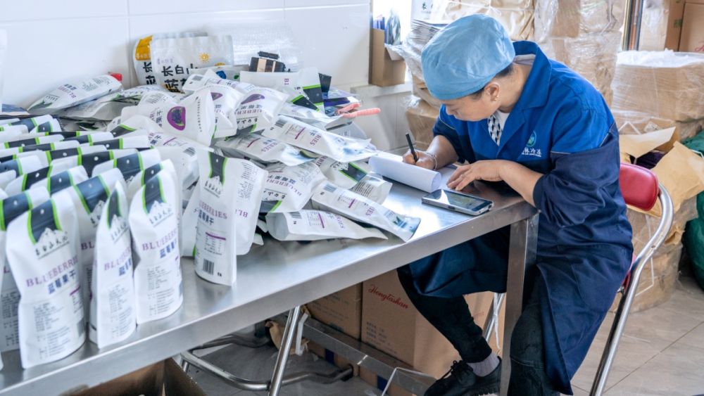 吉林省白山市靖宇县大北山村的园区内,一名工作人员正在登记蓝莓果干订单信息,准备发货。新华社发(唐成卓摄)