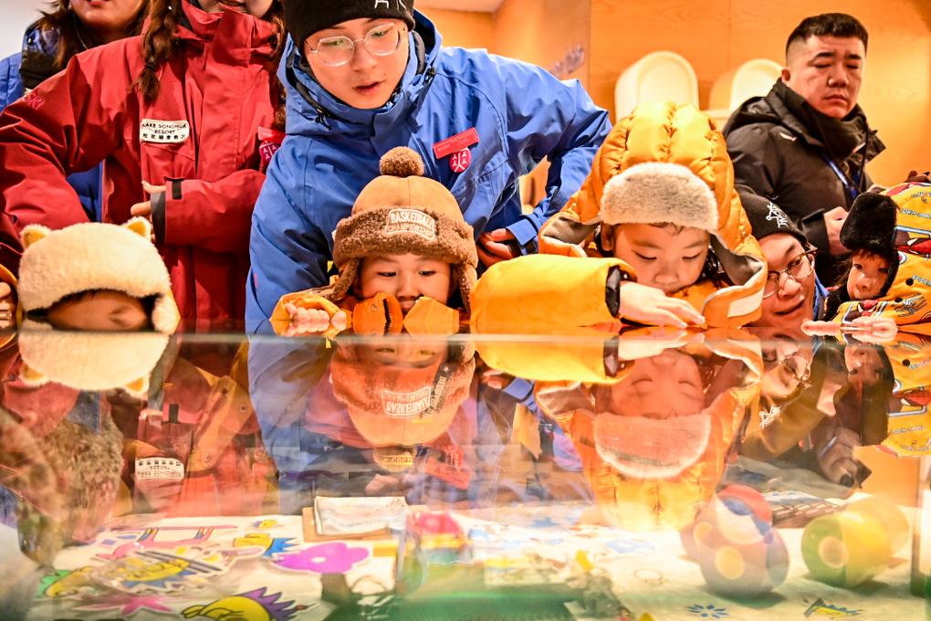 1月8日,来自广西南宁的“砂糖橘”小朋友在吉林市万科松花湖度假区查看旅游纪念品。新华社记者 颜麟蕴 摄