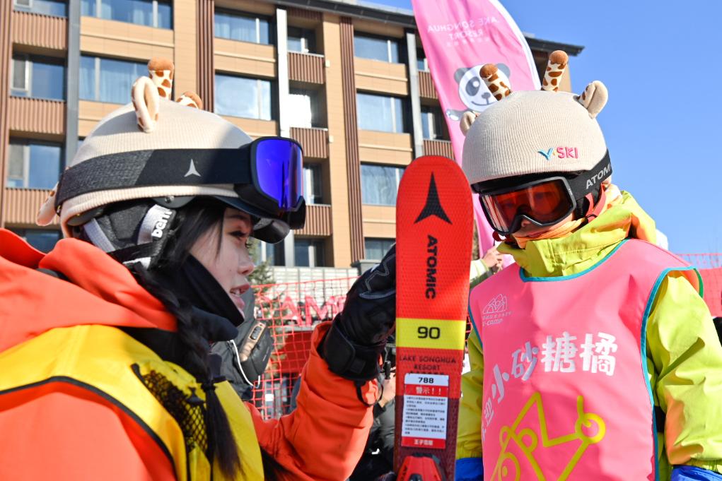 1月8日,滑雪教练在吉林市万科松花湖度假区教来自广西南宁的“砂糖橘”小朋友滑雪。新华社记者 颜麟蕴 摄