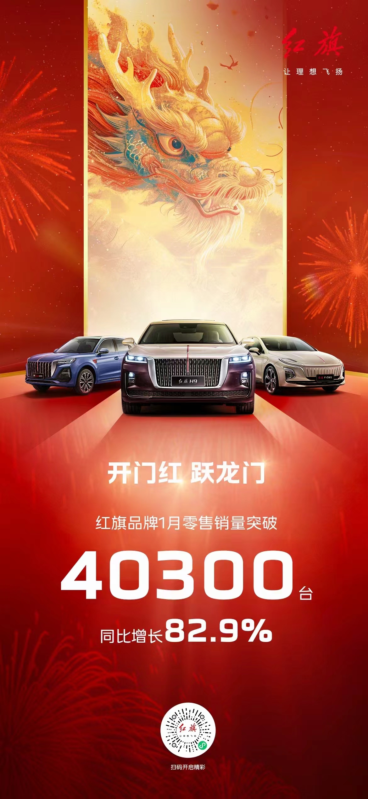 民族汽车品牌红旗1月零售销量突破40300台,同比增长82.9%,实现开门红!