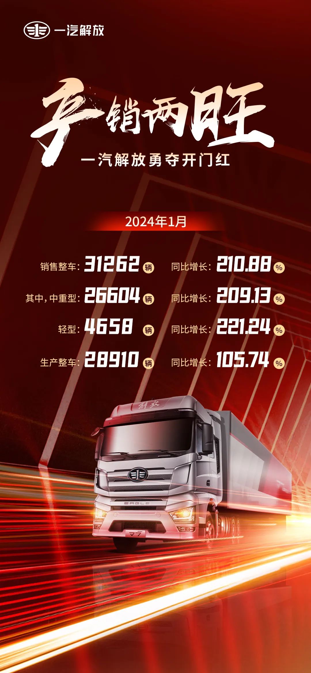 2月6日,一汽解放发布2024年1月份产销快报数据情况。